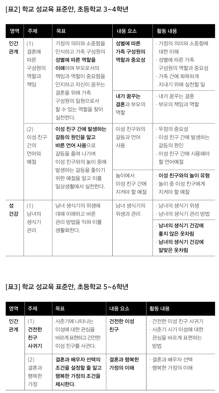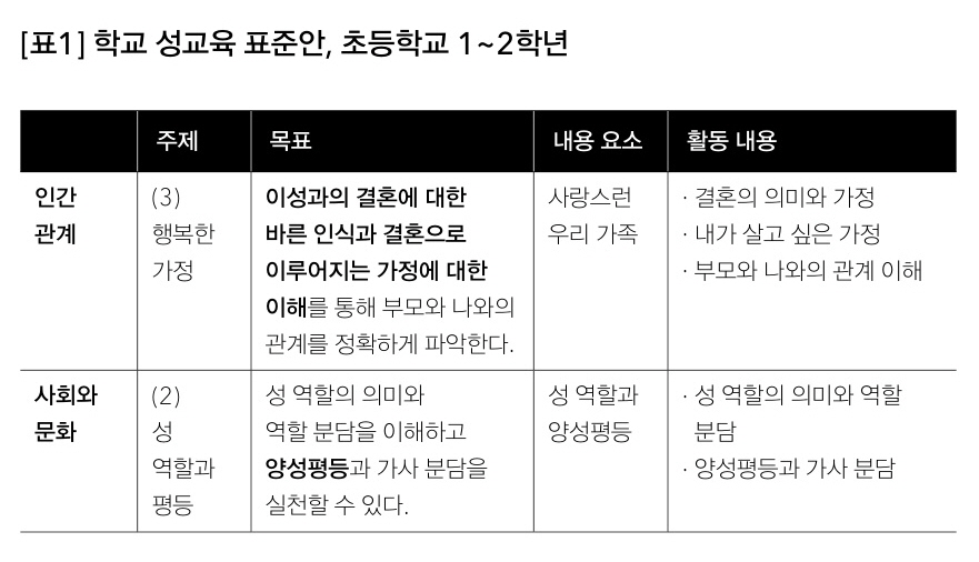 [표1], [표2], [표3]의 내용에서 확인한 것처럼 초등학교 성교육 표준안을 관통하는 첫 번째 문제점은 ‘행복한 가정’과 ‘결혼’의 의미를 봉합하여 결혼에 대한 주입식 교육이 이뤄지고 있다는 점이다. 먼저 [표1]은 ‘행복한 가정’을 주제로 할 때, 이는 ‘이성과의 결혼에 대한 바른 인식’을 목표로 하며, ‘성 역할의 의미’를 배우고, ‘역할 분담’을 ‘가사 분담’과 같은 실천을 통해 ‘양성평등’을 이루고자 하는 것이 활동의 내용이다. 초등학교 중학년으로 올라가면 [표2]에 나와 있듯이 ‘결혼에 따른 구성원의 역할과 책임’에서 ‘성별에 따른 가족 구성원의 역할과 중요성’ 및 ‘내가 꿈꾸는 결혼’에 대해 배운다. 이때, ‘이성 친구’는 잠재적 결혼 대상이 되는데, 활동 내용으로 ‘이성 친구와의 놀이 유형’에 대해 금욕주의적 성교육에서 무엇을 가르치게 되는 것인지 자못 궁금하나, 남녀의 생식기 건강에 좋지 않은 옷차림과 알맞은 옷차림을 배운다는 내용에서 어느 정도 유추 가능할 듯하다.