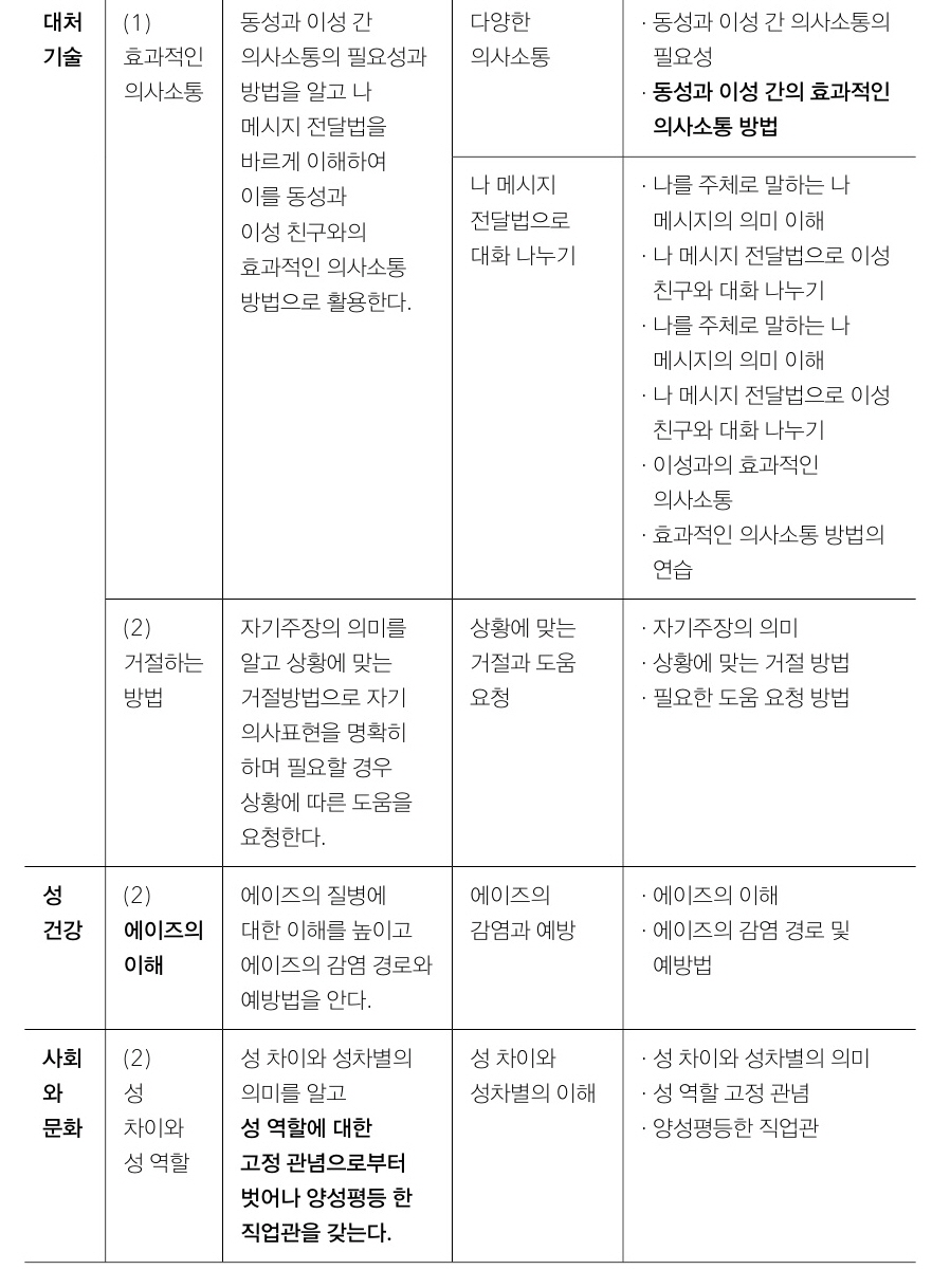 앞서 차별금지법이 성평등한 학교 현장을 조성하는 물질적 토대가 됨을 살펴보았다면, 이제 성평등에 대한 구체적 사항인 포괄적 성교육의 필요성을 알아보자. 아래 표들은 현재까지 이행되고 있는 ‘2015 국가 수준의 학교 성교육 표준안’의 내용 중 가장 핵심적으로 문제적인 내용을 발췌하여 온 것이다. 눈여겨봐야 할 내용이나 단어는 굵은 서체로 표시하였다. 익히 알려져 있듯이 학교 성교육 표준안은 생물학적 지식 전달(조차 제대로 이행될 리 만무한)인 금욕주의 및 순결주의적인 수준에 머물러 있다. 2021년에 개정된 내용 역시 ‘디지털 성범죄’에 대한 단어 추가 수준에 그쳐 아래 표에는 따로 표시하지 않았다.