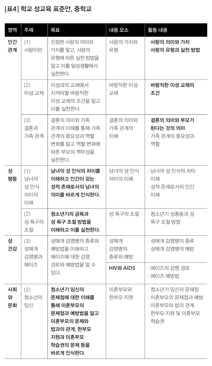 [표3]인 초등학교 고학년의 성교육 표준안에서 가장 주의 깊게 본 내용은 바로 ‘에이즈의 이해’이다. OECD 38개국 가운데 포괄적 성교육을 법률로 규정하지 않은 4개 국가 중 하나인 한국의 순결/금욕주의 성교육은 에이즈에 대하여 어떤 교육을 실시하고 있을까? 매년 12월 1일, 에이즈에 관한 잘못된 정보 및 부정적인 인식을 바로 잡기 위해 1988년부터 세계 에이즈의 날이 지정돼 있음을 배운다면, ‘그나마 다행’일 것 같다. 중학교 성교육 표준안의 내용 중, [표4]에서 ‘청소년기의 금욕’과 ‘성 욕구 조절’, ‘청소년기 임신의 문제점’과 ‘미혼부모의 문제’ 내용 또한 유사한 문제점을 갖고 있다. 성 욕구를 조절하여 금욕적인 교리를 배우는 보수적인 정치 이념과 정상가족 이데올로기를 근본으로 삼고 있는 성교육에서 미혼부모에 대한 차별과 낙인에 대해 이야기하려면 지면이 부족할 듯하다.