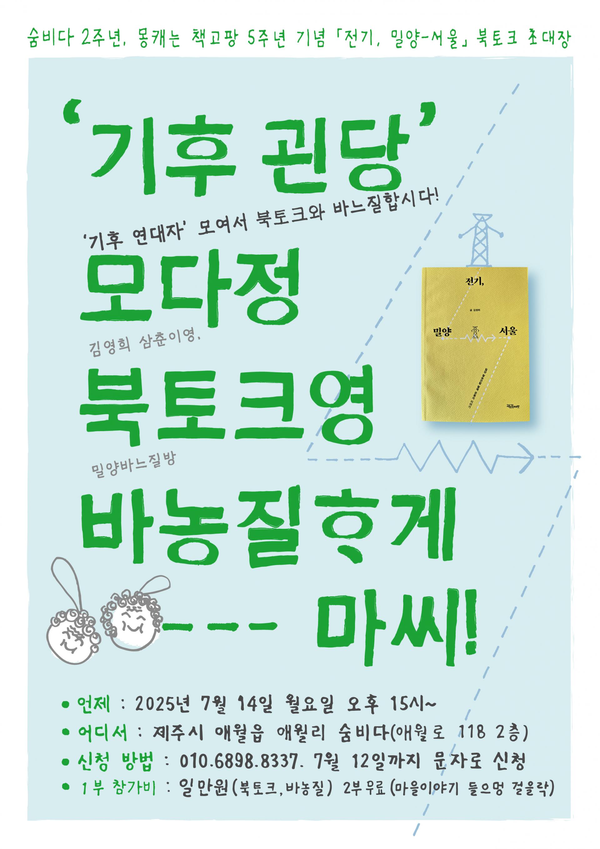 안녕하세요! 몽캐는 책고팡 주인장이우다. 펜안ᄒᆞ여수과?...이번 5주년을 맞아서 숨비다와 함께 서로 관심있는 주제를 이야기해보려고 합니다. 우리 기후에 관심 있는 사람들 모여서 괸당 맹글어 보카마씨? (만들어 볼까요?) 《전기, 밀양-서울》을 함께 읽으면 좋을 것 같습니다. ‘전기, 밀양-서울’은 전기만이 아니라 공동체와 연대를 이야기하는 책입니다. 김영희 작가님과 밀양바느질방에서 별도 초청비 없이 제주에서 이야기 보따리를 풀어주시니, 저는 제가 내어 줄 수 있는 마을 이야기를 들려드리젠 햄수다...